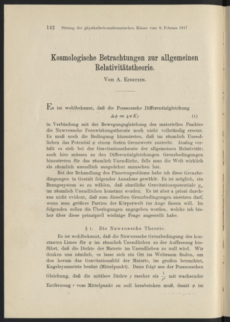1917年2月,他在普鲁士科学院宣讲了这个新成果,并以《基于广义相对论的宇宙学思考》6为题在院刊上发表了篇幅10页的论文,正式发表了他的宇宙模型。